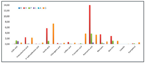 | Gallic Acid | Protocatechuic Acid | 4-Hydroxy Benzoic Acid | Vanilic Acid | Chlorogenic Acid | Caffeic Acid | P-Coumaric Acid | Rosmarinic Acid | Myricetin | Quercitin | Luteolin | Kaempferol | Total Poliphenols | Total Poliphenols Content, mg GAE/100 g | ||
