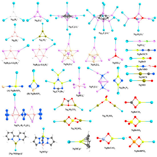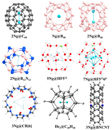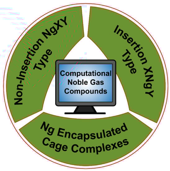 Very recently, Dong et al. showed that at high pressure even He can participate in chemical bonding [30]. They reported a solid Na2He compound with a fluorite-type structure under high pressures greater than 113 GPa. Bonding analysis by the solid-state adaptive natural density partitioning analysis (SSAdNDP) reveals that in the absence of He in the sodium sublattice each Na8 cube only has one electron. Now, in Na2He when helium is included in half of those cubes, the electron density from those cubes occupied by helium gets is pushed to the adjacent empty Na8 cube facilitating the formation of eight-centered two-electron (8c-2e) bonds therein. High pressure is needed for such electron shifting to be effective. Hence, all the Ng elements are known to show chemical reactivity. For more details, the readers are referred to the excellent reviews and articles on the Ng compounds [31,32,33,34,35,36,37,38,39,40,41,42,43,44,45,46,47,48,49,50,51,52,53,54,55]. In the current account, we mainly summarize our theoretical contributions in the Ng field. Our work on Ng compounds can be classified into three main categories, viz., (a) non-insertion of NgXY type, (b) insertion of XNgY type, and (c) Ng encapsulated cage complexes (see Figure 2).