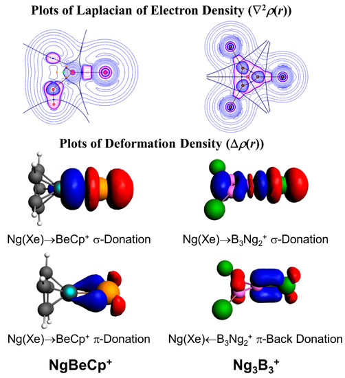 In a further subsequent study, the Ng binding ability of Be and Mg salts of 1-tris(pyrazolyl)-borate was studied by DFT-based studies [95]. The Ng-Be bonds are stronger than that of the Ng-Mg bonds, which is the direct consequence of the small charge to radii ratio in Mg as compared to that in the Be. In these positively charged complexes, the M centers polarize the electron density on the Ng atoms. The EDA in combination with natural orbital for chemical valence (NOCV) also showed that the orbital interactions are the major contributing factors here. In another case, we reported the Ng gas bound half-sandwich complexes, NgMCp+ (M = Be-Ba; Ng = He-Rn, Cp = η5-cyclopentadienyl anion) [96]. In these cases, the dissociation energy values follow the order as Ng-Be > Ng-Mg > Ng-Ca > Ng-Sr > Ng-Ba for a particular Ng atom, whereas for an M atom, the dissociation energy gradually increases along He-Rn. Figure 4 displays the deformation densities associated with the two major orbital contributors. In the plot, the electron density is shifted from red to blue. The major orbital contribution is originated from the Ng(pσ)→BeCp+ σ-donation, whereas Ng(pπ)→BeCp+ π-donation is responsible for the next orbital term. The plot of ∇2ρ(r) also shows electron density accumulated region (pink color) in between Ng and Be, indicating the covalent bond formation.