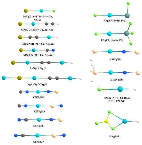 - Jana, G.; Pan, S.; Merino, G.; Chattaraj, P.K. MNgCCH (M= Cu, Ag, Au; Ng= Xe, Rn): The First Set of Compounds with M–Ng–C Bonding Motif. J. Phys. Chem. A 2017, 121, 6491–6499. [Google Scholar] [CrossRef] [PubMed]