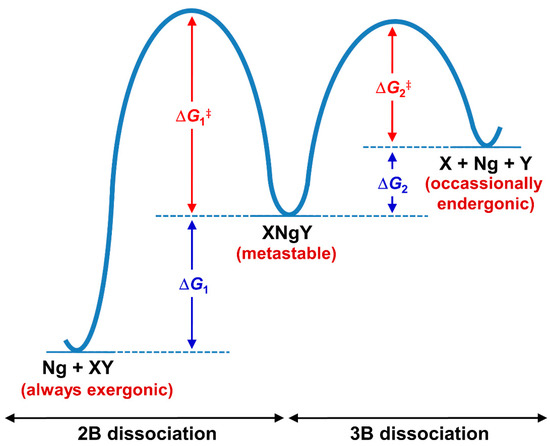 In comparison to the NgXY type, there are some basic differences in the stability of this category. The stability in the former is dictated by the thermodynamic norms of Ng-X bonds. A strong polarizing center always shows strong donor-acceptor interaction with Ng atoms. On the other hand, the stability of XNgY type of compounds is not straightforward as the formation of such molecules needs to compromise the X-Y interaction. Because of the lower reactivity of Ng, in no cases can the sum of X-Ng and Ng-Y interactions compensate the X-Y interaction. Therefore, such molecules are not thermochemically stable species, and rather their existence is driven by kinetics. Generally, for these cases, a large number of dissociation paths need to be considered. The thermochemical studies show that except for the two dissociation channels (shown below), others are highly (or at least moderately) endergonic in nature showing the stability of XNgY. The two most competing dissociation paths are: (i) two-body (2B) dissociation path: XNgY → Ng + XY and (ii) three-body (3B) dissociation path: XNgY → X + Ng + Y. In general, the 2B dissociation channel is highly exergonic in nature, whereas the 3B dissociation occasionally becomes slightly exergonic at room temperature. Therefore, to comment on the stability of XNgY, one should check the activation energy barrier for these paths (see Figure 6). While in most of the cases single reference-based methods are quite reliable to study the transition state (TS) for 2B dissociation, the computation for the barrier of 3B dissociation is complicated as simultaneous bond-breaking that often requires multireference treatment, and, therefore it is hard to evaluate for slightly larger systems. Best systems are those for which the 3-B dissociation path becomes endergonic in nature, at least at low temperatures. Hu and co-workers [112] showed by computations that the half-life of XNgY type of Ng compounds depends on the energy barrier height. An XNgY system with a minimum energy barrier of 6, 13, and 21 kcal·mol−1 would have a half-life in the order of ~102 s at 100, 200 and 300 K, respectively.