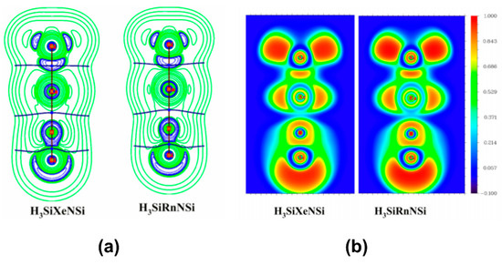 Contour plots of (a) Laplacian of electron density and (b) electron localization function of H3SiNgNSi (Ng = Xe, Rn).