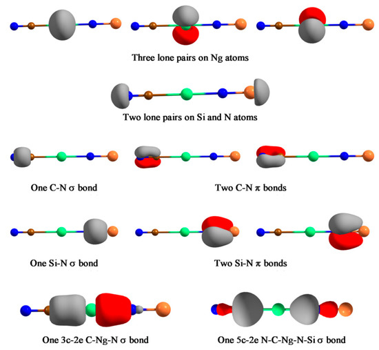 Next, we reported a special system, NCNgNSi (Ng = Kr, Xe, Rn), which represents the first case of a covalently bound C-Ng-N unit [119]. XNgY insertion molecules are, in general, represented as X+(NgY)−. However, these molecules feature the unprecedented case where both C-Ng and Ng-N bond can be represented by an electron-shared bond. Except for a 2B dissociation path, NCNgNSi → Ng + CNSiN, all other dissociation channels are endergonic for Xe and Rn analogues. For NCKrNSi the 3B dissociation channel producing CN, Kr, and NSi, is slightly exergonic at 298 K, thus a lower temperature will make this dissociation channel endergonic. The free energy barrier for the 2B dissociation ranges from 25.2–39.3 kcal·mol−1 for Kr to Rn analogues, with a gradual increase along Kr-Rn is obtained. Thus, the NCNgNSi (Ng = Xe, Rn) systems are viable and may be detected under ambient conditions, whereas the Kr analogue would be detectable at low temperature. The simultaneous existence of C-Ng and Ng-N covalent bonds is confirmed from the sizable WBI value (> 0.5), negative H(rc) values, and the EDA computations. In the latter analysis, the size of the ΔEorb term is a very useful indicator to justify which fragmentation scheme is the best to represent the electronic structure of the overall molecule. The one, which results in the lowest ΔEorb value, is the best to describe the bonding of the molecule as it needs the least change in charge distribution to get the electronic structure of the molecule [120,121]. For both C-Ng and Ng-N bonds, we tested both neutral (electron-shared) and ionic schemes, and in either case the neutral scheme results in the lowest ΔEorb value. AdNDP analysis further corroborates this description which identifies a delocalized 3c-2e σ-bond within the C-Ng-N moiety and a totally delocalized 5c-2e σ-bond in these molecules (see Figure 8). Another interesting fact is that the dissociation of Ng from NCNgNSi produces a higher energy isomer, CNSiN, rather than the most stable parent moiety NCNSi. As such the NCNSi → CNSiN process needs to cross a very high barrier, but in the presence of Ng it gets reduced substantially, hence, Ng could facilitate the detection of the high energy isomer of NCNSi.