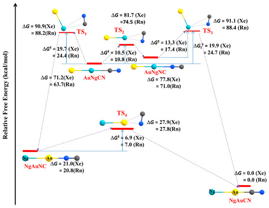 The isomeric transformation occurred in AuNgCN molecules to be converted into the most stable NgAuCN form studied at the MPW1B95/cc-pVTZ/cc-pVTZ-PP level. Relative free energies with respect to the most stable NgAuCN isomer in kcal·mol−1. This figure is reproduced from [123] with permission from the Centre National de la Recherche Scientifique (CNRS) and The Royal Society of Chemistry.