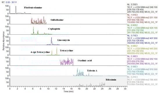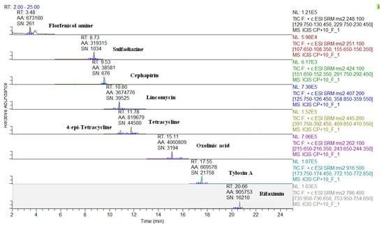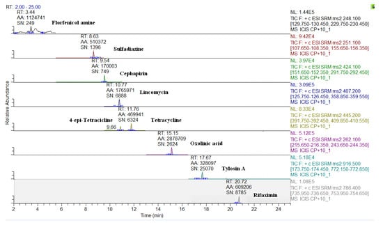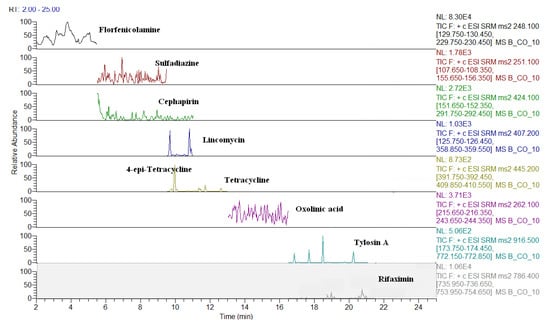 The MS conditions were established without the infusion of the individual solutions of analytes, but by setting the transitions on the basis of the ion fragments previously studied []. As shown in Table 2, apart few exceptions, such as some beta-lactams ([M + Na]+), sulfanilamide ([M + H − NH3]+), spiramycin, neospiramycin, cefquinome, tildipirosin, tilmicosin, tulathromycin marker, and tulathromycin ([M + 2H]++), the selected precursor ion species were generally the protonated molecular ions ([M + H]+). For macrolides, it is not uncommon for the choice of bi-charged ions to be used as a precursor, due to their favorable abundance among the formed charged species []. The sample preparation was exactly the same as that previously optimized by Moretti et al. [,]; however, two internal standards (ISs) were replaced, in order to either, decrease costs (metacycline instead of tetracycline-d6), or to improve the MS response (ceftiofur-d3 instead of cefadroxil-d4). In this context, the ISs were not used for quantification purposes, but only to perform the internal quality control by checking the success of the analytical operations, during the routine application of the procedure as well as to monitor the run-to-run differences in the retention times []. For this purpose, at the beginning of sample treatment, IS were added at 10 µg·kg−1 and, before the release of the results, the presence (S/N > 3) of all eight compounds must be verified. The analyte quantification was achieved by matrix-matched curves (external standardization), which corrected the concentration for the relevant recovery factor []. The LC-QqQ chromatograms of a blank muscle, and of the same spiked at 10 µg·kg−1, are reported in Figure 1 and Figure 2, respectively. Eight representative analytes are shown, starting from the polar metabolite of florfenicol (florfenicol amine, RT = 3.4 min) to the last eluting compound (rifaximin, RT = 20.7 min). The analogous chromatograms are shown also for milk (Figure 3 and Figure 4).