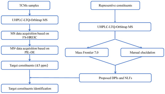 - Zhang, J.Y.; Wang, Z.J.; Zhang, Q.; Wang, F.; Ma, Q.; Lin, Z.Z.; Lu, J.Q.; Qiao, Y.J. Rapid screening and identification of target constituents using full scan-parent ions list-dynamic exclusion acquisition coupled to diagnostic product ions analysis on a hybrid LTQ-Orbitrap mass spectrometer. J. Talanta 2014, 124, 111–122. [Google Scholar] [CrossRef] [PubMed]