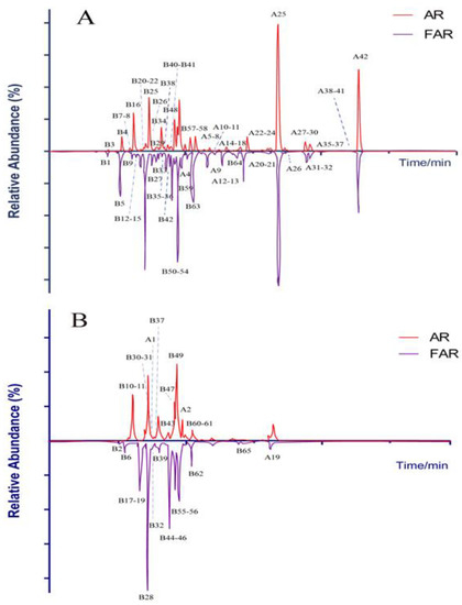 High-resolution extracted ion chromatograms for 107 compounds in AR and FAR. (A) Results of negative ion mode; (B) results of positive ion mode.