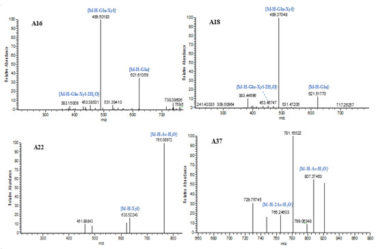 The ESI-MSn spectra of A16, A18, A22, and A37 are shown in Figure 3.