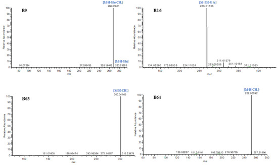 The ESI-MSn spectra of B9, B16, B63, and B64 are shown in Figure 4.