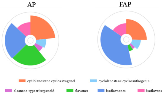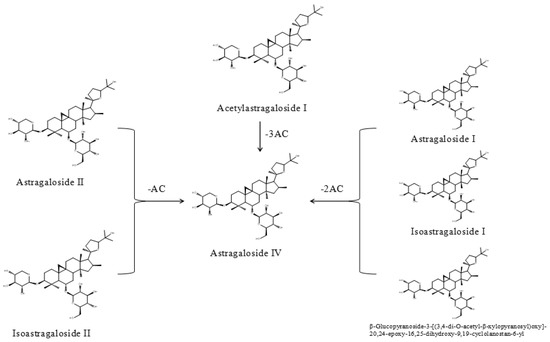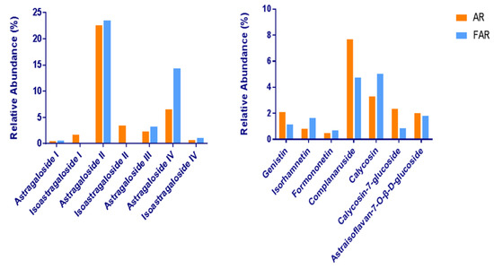 In our work, we found variation of saponins and flavonoids in FAR both in quality and amount, which was different from the former AR extract. The number of saponins species in FAR decreased from 42 to 29, while quantities of certain saponins, such as isoastragaloside IV, increased with the process of fermentation. As above, the flavone aglycones reduced in number from 30 to 25. The species and quantity of flavone glycosides changed obviously, even though the number was 17 in AR as well as in FAR (shown in Figure 5).
