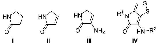 General structure of γ-lactams I, 1,5-dihydro-2H-pyrrol-2-ones II, 3-amino 1,5-dihydro-2H-pyrrol-2-ones II, and dithiopyrrolone antibiotics IV.