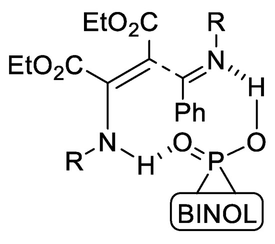 According to the transition state proposed, we may expect substantial enantiomeric excesses for this reaction. However, when enantiomerically pure chiral phosphoric acids were used as catalysts, very poor enantioselectivities were observed with a maximum enantiomeric excess of 5%. This may be attributable to the high temperatures required for the reaction conditions because of the steric hindrance present in the enamine substrate, together with the additional deactivation of the nucleophile due to the presence of two carboxylate groups.