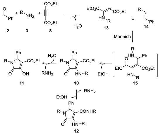 In view of the three compounds observed, the reaction mechanism could start with an initial concomitant addition of amines 3 to acetylene carboxylate 8 and benzaldehyde 2 that affords enamine 13 and aldimine 14. Both species 13 and 14 can be observed by 1H-NMR. Then, a subsequent Mannich reaction leads to the formation of adduct 15, which undergoes an intramolecular cyclization by the formation of an internal amide bond between the amine and carboxylate moieties to afford enamine type γ-lactam 10. Due to the presence of water and some remaining amine 3, the γ-lactam 10 may afford enol type lactam 11 through hydrolysis of the enamine moiety or amide derivative 12, through the displacement of ethanol by the amine (Scheme 3). This is supported by the fact that, using high-boiling-point solvents, no enol derivative 11 is observed, which may be due to the instantaneous evaporation of water at high reaction temperatures.