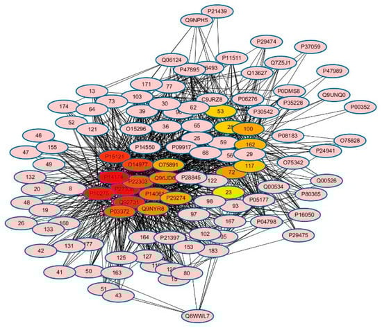 The KEGG enrichment analysis of 49 target proteins was conducted to explore the potential biological pathways intervened by licorice using ClueGO 2.3.5 [], which widely applied in amalgamating the KEGG pathways to construct a functionally efficient pathway network. The localization of the biological and molecular functions of the proteins were detected premised on high confidence with the p-value less than 0.01 calculated by the two-side hypergeometric test method. This p-value indicates the relative importance of enriched pathways for licorice.