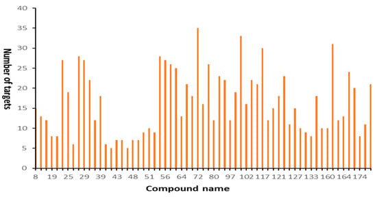 The degree of distribution between compounds and putative targets were also presented in Figure 2. On average, each compound had 16 putative targets. Among them, four compounds, such as compounds 72 (lupalbigenin), 100 (sophoraflavone B), 162 (odoratin-7-O-beta-d-glucopyranoside), and 117 (ononin) can act on more than 30 targets, and lupalbigenin had the most targets and can simultaneously act on 35 targets followed by sophoraflavone B, odoratin-7-O-beta-d-glucopyranoside and ononin. Their chemical names and bioactivity were listed in Table 3. Our study showed that lupalbigenin can simultaneously act on 35 targets, which were widely involved in the biosynthesis and metabolism of neurotransmitters, steroids, anti-inflammatory, anti-tumor, and anti-oxidative stress. Some studies have verified lupalbigenin exhibited anti-tumor activity and anti-dermatophyte activity. They found that lupalbigenin can significantly down-regulate survival proteins, including protein kinase B (pAKT/AKT) and extracellular signal-regulated kinase (pERK/ERK), as well as anti-apoptotic protein B-cell lymphoma 2 (BCL-2) in cancer cells []. Ononin was reported to have beneficial biological effects, including anti-inflammatory effects and antioxidant activity []. However, the bioactivity of sophoraflavone B and odoratin-7-O-beta-d-glucopyranoside has not been reported yet. In general, the compounds with a higher degree of connectivity are more potent pharmacologically. Therefore, these multi-target compounds are of great reference significance for the development of new drugs in the future.
