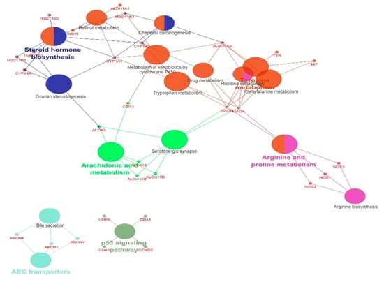 Finally, the pathway enrichment analysis with those target proteins was applied to explore potential biological pathways of licorice by using ClueGO 2.3.5 []. The results showed that those targets were enriched in 17 pathways with p values less than 0.01. We ranked those pathways according to the p-value of each enriched pathways in an ascending order (Table 4) for further mechanism analyses. In clinical practices of TCM, licorice has been incorporated into the treatment of various diseases of respiratory system, digestive system, nervous system, and immune system, such as gastric or duodenal ulcers, bronchitis, cough, arthritis, detoxification, viral hepatitis, adrenal insufficiency, depression, psoriasis, allergies, and cancer for thousands of years. Our study indicated that licorice possessed multi-pharmacological effects involved in steroid hormone biosynthesis, tyrosine metabolism, phenylalanine metabolism, ovarian steroidogenesis, arginine and proline metabolism, arachidonic acid metabolism, serotonergic synapse, metabolism of xenobiotics by cytochrome p450, tryptophan metabolism, arginine biosynthesis, histidine metabolism, retinol metabolism, p53 signaling pathway, drug metabolism, chemical carcinogenesis, ABC transporters, bile secretion. The main KEGG pathways can be roughly grouped into 6 categories, shown in Figure 3, including steroid hormone biosynthesis, arachidonic acid metabolism, ABC transporters, p53 signaling pathway, tyrosine metabolism, and arginine and proline metabolism. Among these pathways enriched by those 49 shared targets, we found that the pathway of ranked 1st was closely related with steroid hormone biosynthesis. Steroid biosynthesis is a complex process in which cholesterol is converted to steroid hormones with the involvement of multiple enzymes and cofactors. As listed in Table 4, seven targets were enriched in the pathway of steroid hormone biosynthesis: CYP19A1, CYP1A1, CYP1A2, HSD11B1, HSD11B2, HSD17B1, and HSD17B. Also, ALOX5, CYP19A1, CYP1A1, HSD17B1, and HSD17B2 enriched in the pathway of ovarian steroidogenesis were influenced by licorice. Thus, the anti-oxidation activity, adrenal cortical hormone-like effect and estrogen-like effect of licorice can be partly accounted for.