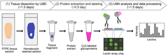 Lectin microarray (LMA) is a lectin-assisted glycan analysis technology used to obtain the global glycomic profiles of both N- and O-glycans in glycoprotein samples. The profiling, which is based on the patterns of lectin-carbohydrate interactions, allows a highly sensitive and high-throughput analysis using a simple and rapid procedure [4,5,6]. Thus, this technology has complementary roles in assessing the glycomes of glycoprotein samples to those of mass spectrometry (MS)-based approaches, which typically involves complicated sample preparation procedures and analytical conditions optimized for target samples and the type of target glycan (i.e., either N- or O-glycans). To meet the demands of spatial tissue glycomics, we developed an LMA procedure for the analysis of formalin-fixed paraffin-embedded (FFPE) tissue sections [7], a general type of pathological specimen. Furthermore, we improved the accuracy and reproducibility of this LMA analysis by the additional use of laser microdissection (LMD) for tissue dissection. This standardized LMD–LMA method enabled us to obtain information on site- and tissue-specific protein glycosylation, which was demonstrated by the differential glycomic profiling of five mouse organs (brain, liver, kidney, spleen, and testis) [8].