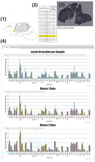 Here, as the first atlas of LMA-based tissue glycome mapping data, we developed a novel tool called “LM-GlycomeAtlas” (https://glycosmos.gitlab.io/lm-glycomeatlas). This freely available online tool has a similar interface as GlycomeAtlas (https://glycosmos.gitlab.io/glycomeatlas), which was previously a Flash-based online tool that could visualize glycan structures across tissues based on the MS data provided by the Consortium for Functional Glycomics (CFG) [9]. It has since been updated to use HTML5 so that it is compatible with current web browser technology. Similar to the GlycomeAtlas, the LM-GlycomeAtlas allows users to visualize LMA-based tissue glycomic profiling data that are associated with sample information, including images of dissected areas and the condition of LMA analysis. Using this tool, we present an unpublished dataset consisting of the glycomic profiles of nine mouse tissues (pancreas, heart, lung, thymus, gallbladder, stomach, small intestine, colon, and skin) obtained from two 8-week-old male C57BL/6J mice.