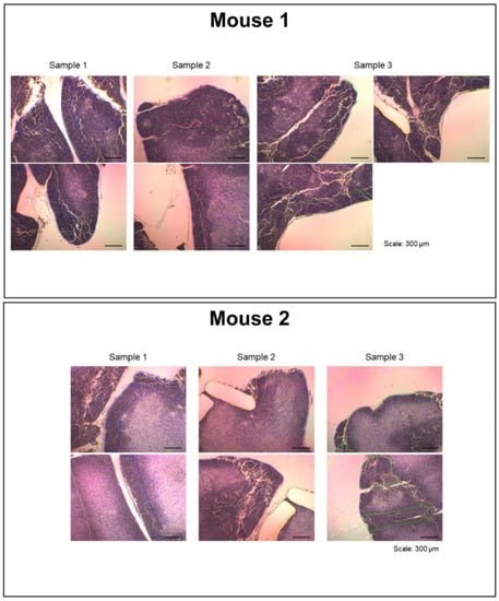 Tissue sections were prepared as described previously [19]. Briefly, tissues collected from anesthetized 8-week-old male mice were fixed with 4% paraformaldehyde in phosphate buffered saline (PBS) for 24 h at room temperature (RT; approximately 25 °C) and then embedded in paraffin. Tissue sections (5 μm thick) were mounted on poly-L-lysine-coated polyethylene naphthalate- membrane glass slides (Leica Microsystems, Wetzlar, Germany).