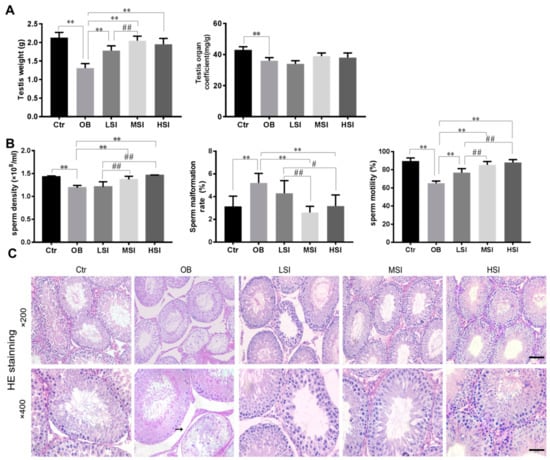 Testosterone (T) has a pivotal role on the beginning and maintaining of spermatogenesis, and luteinizing hormone (LH) plays a key role in the production of testosterone by stimulating Leydig cells. Sertoli cells are the somatic cells within testis that are regulated by follicule-stimulating hormone (FSH) stimulation and paracrine function of T to support spermatogenesis [34]. The levels of plasma FSH, LH and gonadotropin-releasing hormone (GnRH) in the OB group were significantly lower than those in the Ctr group, and reached the minimum. It was worth noting that plasma FSH, LH and GnRH concentrations in SIF groups were markedly enhanced relative to the obesity group and also showed a dose-dependent increase (Figure 2A–C). In obese rats, the plasma T level was remarkably decreased, while plasma 17β-estradiol (E2) level was significantly increased compared with the control. SIF significantly decreased the plasma E2 level when compared to obese rats. The T level among the 150 and 450 mg/kg SIF-added groups were significantly different from those in OB group. More interestingly, the 450 mg/kg SIF was significantly better than the 150 and 50 mg/kg SIF in the abnormal recovery of plasma T and E2 levels in obese rats (Figure 2D,E).