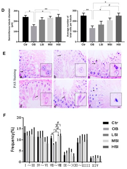Figure 1. Soy isoflavones (SIF) promote spermatogenesis in diet-induced obese (DIO) male rats. (A) Effects of SIF on the testis weight and the testicular coefficient of adult male obese rats. (B) Effects of SIF on the sperm parameters of adult male obese rats. (C) Histological morphology of testis stained with HE from the five groups; pathological changes of seminiferous tubule (black arrow); magnification: ×200; scale bar: 100 μm. Magnification: ×400; scale bar: 50 μm. (D) Quantifcation shows the diameter of seminiferous tubules and mean number of the total cells per tubule of the five groups. (E) The testicles of rats staining with PAS-H staining. (a) I–III stages. Acrosomal vacuole (black arrow); (b) IV–VI stages. Acrosome (black arrow); (c) VII-VIII stages. Acrosome (black arrow) and residual body (black triangle); (d) IX-X stages. The circular sperm nuclei move from the center to the cell near the cell membrane side (black arrow); (e) XI-XIII stages. Sperm cells are further deformed, nuclear condensation(black arrow); (f) XIV stages. Meiotic phase (black triangle). Scale bar: 10 μm; Magnification: ×1000. (F) Quantification shows the seminiferous epithelial cycle count. Each bar denotes mean ± SD of eight rats. * p < 0.05, ** p < 0.01 vs. OB group; # p < 0.05, ## p < 0.01 vs. LSI; Δ p < 0.05, ΔΔ p < 0.05vs. MSI, one-way ANOVA analysis and Least—Significant Difference (LSD) test.