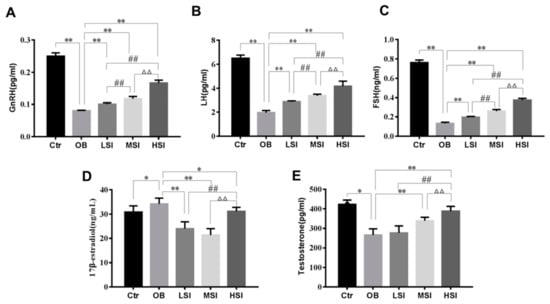 Figure 2. Effects of SIF on plasma reproductive hormone. Quantification shows (A) plasma gonadotropin-releasing hormone (GnRH) levels, (B) plasma luteinizing hormone (LH) levels, (C) plasma follicle-stimulating hormone (FSH) levels, (D) plasma E2 levels and (E) plasma T levels. Bars represent the mean ± SD, * p < 0.05, ** p < 0.01 vs. OB; # p < 0.05, ## p < 0.01 vs. LSI; Δ p < 0.05, ΔΔ p < 0.05 vs. MSI, one-way ANOVA analysis and LSD test.