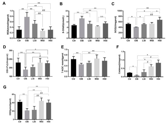 Figure 3. SIF treatment attenuated oxidative stress. (AG) Effect of SIF on malondialdehyde (MDA), 8-OhdG, superoxide dismutase (SOD), glutathione peroxidase (GSH-Px), total anti-oxidant capacity (T-AOC), catalase (CAT) and reduced glutathione (GSH) of testicular tissue in rats (n = 8). Bars represent the mean ± SD, * p < 0.05, ** p < 0.01 vs. OB; # p < 0.05, ## p < 0.01 vs. LSI; Δ p < 0.05, ΔΔ p < 0.05 vs. MSI, one-way ANOVA analysis and LSD test.