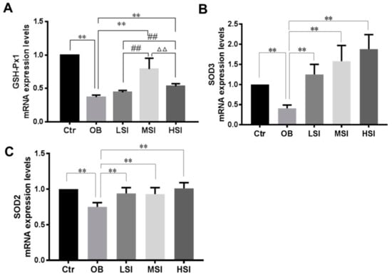Figure 4. Effect of SIF on mRNA expression level of (A) GSH-Px1, (B) SOD3, (C) SOD2 (n = 8). Bars represent the mean ± SD, * p < 0.05, ** p < 0.01 vs. OB; # p < 0.05, ## p < 0.01 vs. LSI; Δ p < 0.05, ΔΔ p < 0.05 vs. MSI, one-way ANOVA analysis and LSD test.