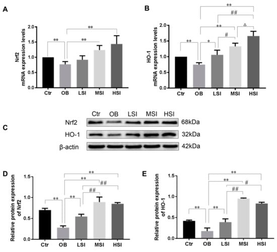 Figure 5. SIF treatment resulted in the activation of Nrf2/hemeoxygenase 1 (HO-1). (A,B) represent mRNA expression level of Nrf2 and HO-1 in the indicated groups (n = 8). (C) represents western blotting (WB) banding pictures of Nrf2 and HO-1. (D,E) represent protein expression levels of Nrf2/HO-1 in the testis tissue of the indicated groups (n = 8). Bars represent the mean ± SD, * p < 0.05, ** p < 0.01 vs. OB; # p < 0.05, ## p < 0.01 vs. LSI; Δ p < 0.05, ΔΔ p < 0.05 vs. MSI, one-way ANOVA analysis and LSD test.