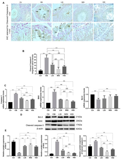 Figure 6. SIF reduced excessive apoptosis of testicular germ cells in obese rats by increased levels of Bcl-2 and decreased levels of BAX and caspase-3. (A) IHC detection of cleaved caspase-3 expression in testicular tissue. Cleaved caspase-3 positive and negative cells were stained in brown colored and bluish violet, respectively. Black arrowheads: Cleaved caspase-3 positive cell. Magnification: 400×; scale bar: 50 μm. Magnification: 1000×; scale bar: 10 μm. (B) IOD of cleaved caspase-3 protein expression in the testis. (C) mRNA expression level of Bcl-2,BAX and caspase-3 in the indicated groups (n = 8). (D,E) proteins expression level of Bcl-2, BAX and cleaved caspase-3 in the indicated groups (n = 8). Bars represent the mean ± SD, * p < 0.05, ** p < 0.01 vs. OB; # p < 0.05, ## p < 0.01 vs. LSI; Δ p < 0.05, ΔΔ p < 0.05 vs. MSI, one-way ANOVA analysis and LSD test.