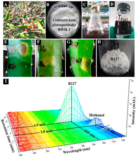 Figure 1. Bioactivity-guided isolation of the major phytotoxin produced by Colletotrichum gloeosporioides BWH-1. (A) Anthracnose disease of Bawanghua (Hylocereus undatus); (B) the pathogenic fungus C. gloeosporioides BWH-1; (C) liquid cultures of the strain BWH-1; (D) ethyl acetate (EtOAc) crude extracts of the liquid cultures; (E) puncture bioassay of EtOAc crude extracts; (F) puncture bioassay of fraction 82 isolated from EtOAc crude extracts; (G) puncture bioassay of fraction R127 isolated from fraction 82; (H) white crystals of R127 after purification; (I) purity check of R127 (265nm, 4.9min) by HPLC-DAD-3D chromatogram.