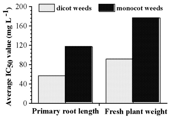 In addition, the average IC50 value of dirhamnolipid on the primary root length of tested dicot weeds (56.93 mg L−1) was two times lower than that of monocot weeds (117 mg L−1) (Figure 3). Meanwhile, the average IC50 value of dirhamnolipid on the fresh plant weight of dicot weeds (91.61 mg L−1) was 1.93 times lower than that of monocot weeds (176.87 mg L−1) (Figure 3). These results indicate that the dirhamnolipid showed better herbicidal activity against dicot weeds than monocot weeds.