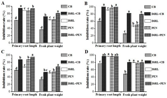 Figure 4. Inhibition rates of dirhamnolipid combined with cyhalofop-butyl or penoxsulam on the primary root length and fresh plant weight of four test dicot weeds at the concentration of 100 mg L−1 (7d). (A) B. pilosa; (B) M. micrantha; (C) A. retroflexus; (D) A. Conyzoides. CB: Cyhalofop-butyl. DiRL + CB: Dirhamnolipid combined with cyhalofop-butyl. DiRL: Dirhamnolipid. PEN: Penoxsulam. DiRL + PEN: Dirhamnolipid combined with penoxsulam. Same letter represent values that are not significantly different at the 0.05 probability level according to Duncan’s multiple range test.