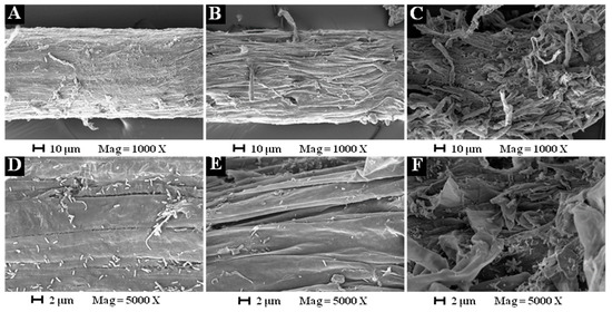 Figure 5. Scanning Electron Microscope (SEM) observation on the root tip mature area of Bidens pilosa. (A,D) Untreated control (magnification, ×1000 and ×5000); (B,E) treated with 500 mg L−1 dirhamnolipid (magnification, ×1000 and ×5000); (C,F) treated with 1000 mg L−1 dirhamnolipid (magnification, ×1000 and ×5000).
