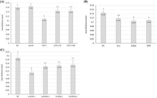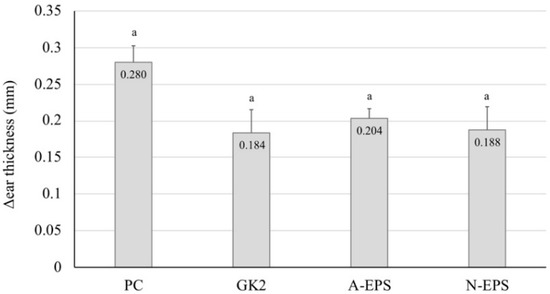 To evaluate the direct effect of EPSs on the skin, dipotassium glycyrrhizinate, which is an anti-inflammatory compound, was used as a positive control. In the procedure, 2 h after the challenging, 20 μL of EPS solution or dipotassium glycyrrhizinate (1 mg/mL each) was applied to the back and front surfaces of the ears of mice without an oral administration phase. The ear thickness was measured after an additional 20 h of breeding. The animal experiment is summarized in Figure 7.