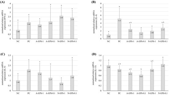 Effects of oral administration of IJH-SONE68-derived neutral and acidic EPSs on the mRNA level of IFN-γ (A), IL-4 (B), IL-5 (C), and IL-13 (D) expressed in the ear homogenates at 24 h after the challenge. Each expression level was normalized to that of the β-actin gene as a reference. Abbreviations used in the figure: NC, negative control (without inflammation); PC, positive control (without treatment); A-EPS-1, acidic EPS (1 mg/mL); A-EPS-0.1, acidic EPS (0.1 mg/mL); N-EPS-1, neutral EPS (1 mg/mL); N-EPS-0.1, neutral EPS (0.1 mg/mL). Data are indicated by mean ± S.D. Different characters described on the top of the bars indicate statistically significant differences between means of values obtained in different group (the Tukey–Kramer test, p < 0.05).