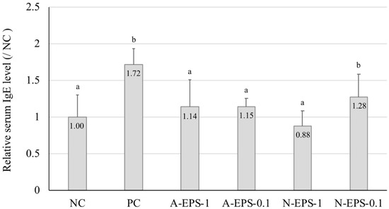 Effect of oral administration of IJH-SONE68-derived neutral and acidic EPSs on the serum IgE concentration at 24 h after the challenge. Abbreviations used in the figure: NC, negative control (without inflammation); PC, positive control (without treatment); A-EPS-1, acidic EPS (1 mg/mL); A-EPS-0.1, acidic EPS (0.1 mg/mL); N-EPS-1, neutral EPS (1 mg/mL); N-EPS-0.1, neutral EPS (0.1 mg/mL). Different characters described on the top of the bars indicate statistically significant differences between means of values obtained in different group (the Tukey–Kramer test, p < 0.05).