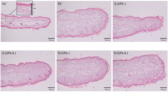 Effect of oral administration of IJH-SONE68-derived neutral and acidic EPSs to the ear lobe of PiCl-induced contact dermatitis mice. A representative tissue section of the ear lobe was stained with hematoxylin and eosin. Abbreviations used in the figure: NC, negative control (without inflammation); PC, positive control (without treatment); A-EPS-1, acidic EPS (1 mg/mL); A-EPS-0.1, acidic EPS (0.1 mg/mL); N-EPS-1, neutral EPS (1 mg/mL); N-EPS-0.1, neutral EPS (0.1 mg/mL); EP, epidermis layer; DM, dermis layer; C, cartilage. Scale bar = 500 μm.