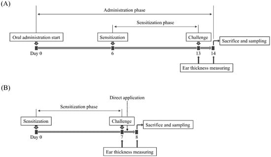 Outline of the animal experiment. Mice were sensitized with PiCl 7 days before the allergen challenge. (A) After a one-week acclimation period, 200 μL of each sample was orally administered once a day during the experimental period until sacrifice. At day 13, the mice were challenged via the ear with PiCl. After 24 h, the mice were sacrificed. (B) Instead of oral administration, each sample was directly applied to the ear lobe after 2 h of the allergen challenge.