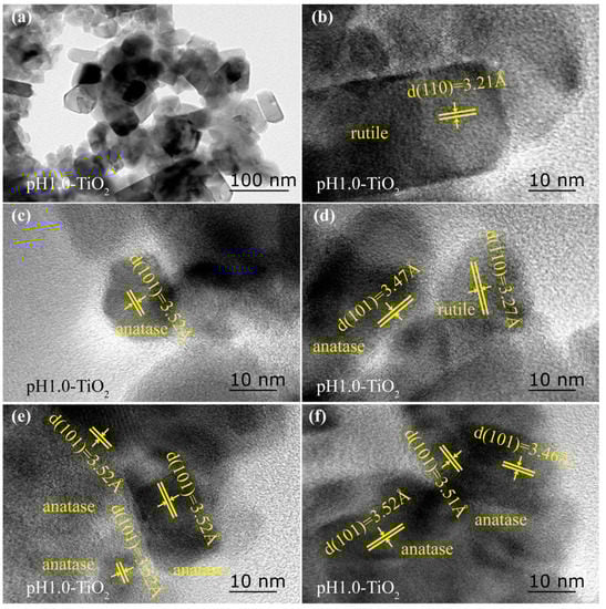 pH1.0-TiO2 is also amixture of anatase and rutile phase (see Figure 1b) and also has a rod-like particle morphology with a size about 80–130 nm in length and 15–30 nm in width, a cuboid particle morphology with a size about 25–50 nm in length and 10–30 nm in width, and some irregularly shaped particles (Figure 3a). The lattice fringes with spacings of 3.21Å (or 3.27 Å) can be assigned to {110} facets of the rod-like rutile particles (or the approximated rhombic rutile particles), which are parallel to the lateral surface, indicating that the lateral surface exposed {110} facets of the rod-like rutile particles (or the approximated rhombic rutile particles) (Figure 3b,d). In addition, rod-like (or cuboid, irregular morphology) anatase nanoparticles with exposed {101} facets (d = 3.46~3.52 Å) on the lateral surface were also observed, indicating that it exposed the {101} facets on the lateral surfaces (Figure 3c–f).