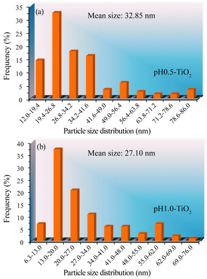 Particle size distribution of (a) pH0.5-TiO2 and (b) pH1.0-TiO2.