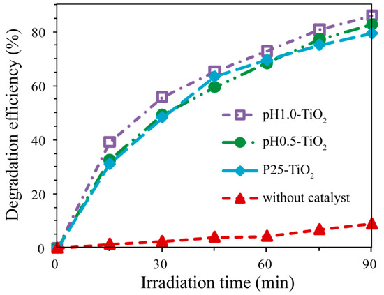 The above reactions are chosen because both the electrons and holes eventually participate in the formation of ·OH radicals, which degrade the MB. Figure 5 shows the UV-vis spectral changes of MB aqueous solution as a function of UV irradiation time in the presence of pH0.5-TiO2, pH1.0-TiO2, P25-TiO2, and absence of any other catalysts. The corresponding time-dependent photodegradation profiles of MB are shown in Figure 6. Figure 5a–c shows that the maximal absorption spectra of MB at 664 nm blue-shifts by as much as 34 nm from 664 to 630 nm, indicating that the N-demethylation occurred during the course of the photodegradation of the MB aqueous solution [30]. Examination of the spectral variation of Figure 5a–c suggests that MB is demethylated in a stepwise manner, that is, methyl groups are removed one by one as confirmed by the gradual shift of maximal absorption peak towards the shorter wavelength. During the initial period of the photodegradation of MB, competitive reactions between demethylation and cleavage of the MB chromophore ring structure (phenothiazine or thionine) occur, with demethylation predominating. Irradiation by UV light for longer times leads to further decomposition of the demethylated MB intermediates as indicated by changes in peak intensity at 630 nm [28,30]. However, in the absence of photocatalysts, the absorption spectra of MB changes relatively little for every measurement under UV light irradiation with the extension of irradiation time (Figure 5d). It is clearly seen from Figure 6 that pH1.0-TiO2 shows the highest photocatalytic activity and pH0.5-TiO2 shows slightly lower photocatalytic activity than pH1.0-TiO2, while P25-TiO2 shows much lower photocatalytic activity than pH1.0-TiO2. Totals of 85.8%, 82.6%, and 79.4% MB were photodegraded for pH1.0-TiO2, pH0.5-TiO2, and P25-TiO2, respectively, under UV irradiation for 90 min. It also can be seen that the blank sample shows the lowest photocatalytic activity, displaying only 8.9% photodegradation of MB under UV irradiation for 90 min.