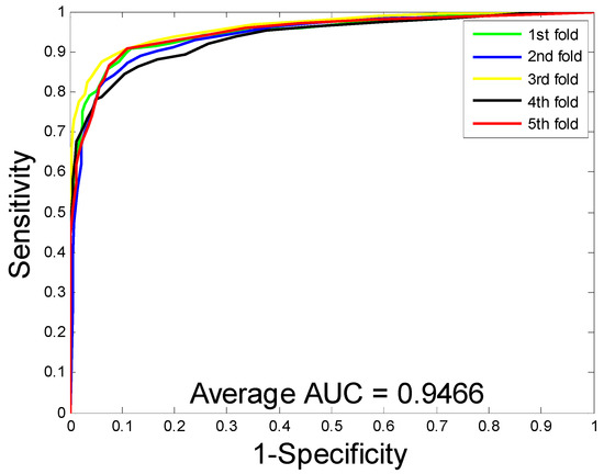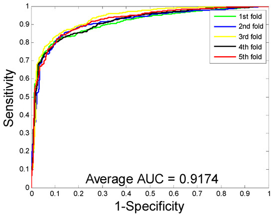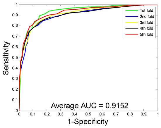 We combined the same feature extraction method with the popular support vector machine (SVM) classifier to predict the DTIs on the enzyme dataset to further assess the prediction results of the proposed method. Here, the five-fold cross-validation method is used in this experiment to compare the prediction performance of the SVM with that of the proposed model. The LIBSVM tool [21] is applied to perform classification for drug-target interaction prediction. At the same time, we also need to use the grid search method to optimize the relevant parameters of the SVM classifier in the experiment. Table 5 summarizes the predicted results of the RF and SVM classifiers on the enzyme dataset. As a result, the average values of accuracy, precision, sensitivity, and MCC were 85.20%, 85.73%, 84.45%, and 74.76%, respectively, with standard deviations of 0.82%, 0.99%, 1.64%, and 1.15%, respectively. Figure 5 shows the ROC curves that were generated on the enzyme dataset while using SVM. Comparing the prediction results of the two classifiers, we can see that, while using the same feature descriptor, the prediction performance that was yielded by the rotation forest classifier is significantly better than that yielded by the support vector machine classifier.