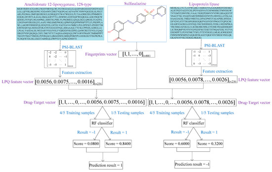 As a result, we obtain the distribution of the integer values of all the pixels in the image f ( x ) , and these results are used as a 256-dimensional feature vector for further classification. In this work, we used the LPQ method to analyze the four target protein datasets, and finally converted the PSSM of each protein sequence into a 256-dimensional feature vector. The predicted results for a given drug and target protein based on the proposed method are displayed in Figure 6. We illustrate the prediction of the interactions between a drug, Sulfasalazine, and two target protein sequences. The length of the sequence, named Arachidonate 12-lipoxygenase, 12S-type is 663, and the length of the sequence named Lipoprotein lipase is 475. According to the results, we can see that the drug Sulfasalazine is predicted to interact with target protein Arachidonate 12-lipoxygenase, 12S-type with possibility score of 0.844, and not to interact with target protein Lipoprotein lipase with possibility score of 0.3200.