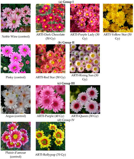 Twelve Chrysanthemum morifolium cultivars. (a) Group I: the mutant cultivars ‘ARTI-Purple Lady’ (30 Gy), ‘ARTI-Yellow Star’ (50 Gy), ‘ARTI-Dark Chocolate’ (50 Gy) derived from the original cultivar ‘Noble Wine’; (b) Group II: the mutant cultivars ‘ARTI-Red Star’ (50 Gy) and ‘ARTI-Rising Sun’ (30 Gy) derived from the original cultivar ‘Pinky’; (c) Group III: the mutant cultivars ‘ARTI-Purple’ (40 Gy) and ‘ARTI-Queen’ (30 Gy) derived from the original cultivar ‘Argus’; (d) Group IV: the mutant cultivars ‘ARTI-Rollypop’ (70 Gy) from the original cultivar ‘Plaisir d’amour’.