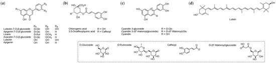 Structures of the standard materials. (a) Flavonoids; (b) phenolic acids; (c) anthocyanins; (d) carotenoids.