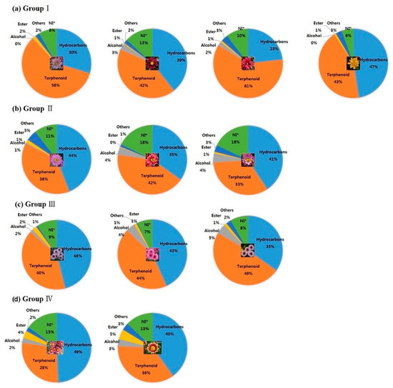 Relative contents (%) of volatile compounds released from the flowers of the 12 chrysanthemum cultivars. (a) Group I: ‘Noble Wine’, ‘ARTI-Dark Chocolate’, ‘ARTI-Purple Lady’, and ‘ARTI-Yellow Star’; (b) Group II: ‘Pinky’, ‘ARTI-Red Star’, and ‘ARTI-Rising Sun’; (c) Group III: ‘Argus’, ‘ARTI-Purple’, and ‘ARTI-Queen’; (d) Group IV: ‘Plaisir d’amour’ and ‘ARTI-Rollypop’. NI: not identified.