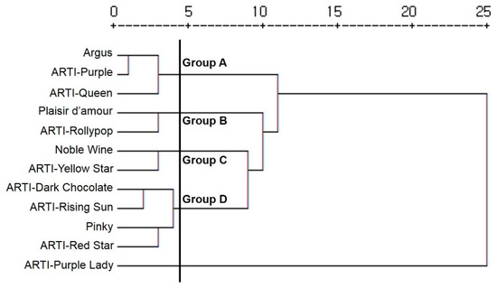 To compare the volatile compound compositions among the eight chrysanthemum mutant cultivars and the three original cultivars, we performed a cluster analysis based on the contents of the 57 volatile compounds detected by GC-MS analysis (Figure 4). The cluster analysis divided the chrysanthemum cultivars into four clusters and one independent cultivar. Group A consisted of ‘Argus’ and two mutant cultivars (‘ARTI-Purple’ and ‘ARTI-Queen’) derived from ‘Argus’. Group B consisted of ‘ARTI-Rollypop’ and its original cultivar ‘Plaisir d’amour’. Group C contained the mutant cultivar ‘ARTI-Yellow Star’ and the original cultivar ‘Noble Wine’. Group D consisted of ‘Pinky’, two mutant cultivars (‘ARTI-Rising Sun’ and ‘ARTI-Red Star’) derived from ‘Pinky’, and ‘ARTI-Dark Chocolate’. ‘AERI-Purple Lady’ was not placed in a group.