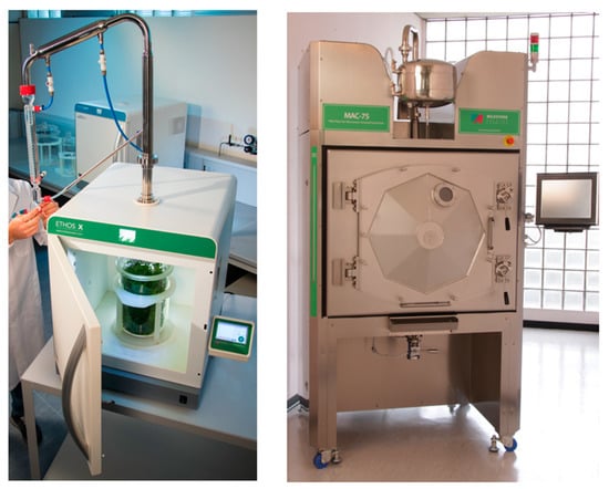 Autoclaves are used in supercritical fluid extraction (SFE), and comprise four main components: (i) a pump, to ensure volumetric flow of the fluid; optionally it can be preceded by a cooler for transportation of gaseous components in liquid state, (ii) a heat exchanger, (iii) an extractor, where static and dynamic extractions take place by modulating the pressure regulated by a valve, and (iv) a separator (Figure 5).