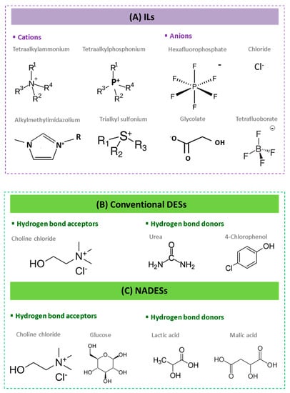 Most common components of ILs, DESs and NADESs. (A) Cations and anions most commonly used for the preparation of ILs. Hydrogen bond acceptors and hydrogen bond donors most commonly used for the preparation of DESs (B) and NADESs (C).